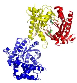 Modell der Tertiärstruktur der cytosolischen Domänen einer Adenylylcyclase (rot: C1, gelb: C2) in Komplex mit einem G-Protein (blau: Gαs) und dem Substrat ATP sowie dem Aktivator Forskolin (grün)