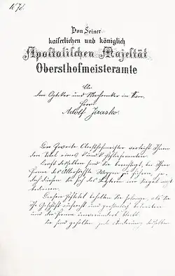 Urkunde des k.u.k. Hoftitels an Adolf Jirasko vom 2. März 1898