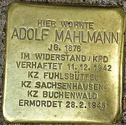 - Im Juli 2023 wurde für Adolf Mahlmann in Hamburg-Nord in der Kegelhofstraße 24 ein Stolperstein verlegt.