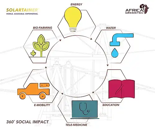 Africa GreenTec entwickelt und produziert unter Einbindung lokaler Arbeitskräfte für den afrikanischen Kontinent mobile „Solartainer“: Solarmodule für Batteriespeicher, Wasserreinigungsanlagen, Satellitenantennen, welche in einem Container verbaut sind.[57][32] Der Strom wird per Vorauskasse über intelligente Zähler an die Dorfbewohner verkauft. Ein smartes Minigrid verteilt den Strom und ermöglicht Datenanalysen sowie Fernwartung.[68] Die eingesetzten Solarmodule können die alten Dieselgeneratoren ersetzen[3] und sparen CO2-Emissionen sowie längerfristig Kosten ein.[69][70] Je nach Bedarf lassen sich mehrere Solarcontainer zu einem noch größeren Inselnetz zusammenschalten.[69]