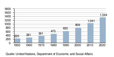 | Jahr[15] | 0 | 1000 | 1500 | 1600 | 1700 | 1820 | 1870 | 1913 | 1950 | 1973 | 1998 | 2018 | 2100 (projiziert) |