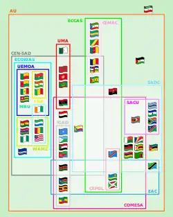 Die Afrikanische Union (arabisch الاتحاد الأفريقي, DMG al-Ittiḥād al-Ifrīqī, englisch African Union, französisch Union africaine, portugiesisch União Africana, spanisch Unión Africana, Swahili Umoja wa Afrika)[4] ist eine Internationale Organisation, die 2002 die Nachfolge der Organisation für Afrikanische Einheit (OAU) angetreten hat und sich für Kooperation auf allen Gebieten einsetzt. Sie ist ein Zusammenschluss von anfangs 53, inzwischen 55[5] afrikanischen Staaten (Westsahara ist Mitglied der Afrikanischen Union, sein völkerrechtlicher Status allerdings umstritten). Mitgliedstaaten der AU sind alle international allgemein anerkannten afrikanischen Staaten, einschließlich Westsaharas. Marokko wurde am 30. Januar 2017 nach 33 Jahren Abwesenheit wieder in die Organisation aufgenommen.[6]
