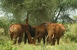 Das Sozialverhalten des Afrikanischen Elefanten ist komplex. Es gibt hierbei deutliche Unterschiede zwischen männlichen und weiblichen Individuen. Bei weiblichen Tieren sind insgesamt vier soziale Einheiten bekannt. Die Basis und niedrigste Stufe (erste Ebene) besteht aus dem Muttertier und einem oder mehreren Jungtieren. Mehrere dieser kleinen Mutter-Jungtier-Einheiten schließen sich zur Familiengruppe beziehungsweise Herde zusammen (zweite Ebene). Die Familiengruppe stellt die stabile Einheit in der Sozialgemeinschaft des Afrikanischen Elefanten dar, sie wird nicht durch jahreszeitliche Bedingungen und Ressourcen beeinflusst. Sie setzt sich gemäß Untersuchungen im Samburu-Nationalreservat aus 2 bis 16 Individuen zusammen. Allgemein kann gesagt werden, dass Familiengruppen in geschlosseneren Landschaften kleiner sind als in offenen, ebenso übertreffen die Familiengruppen älterer Kühe jene von jüngeren an Individuenanzahl. Die Mitglieder sind in der Regel miteinander verwandt. Einzelne Herden, unter anderem solche in Gebieten mit stark durch den Menschen beeinflussten Populationen, umfassen aber nicht zwangsläufig untereinander genetisch verwandte Tiere.[39][40] An der Spitze der Herde steht eine reife, meist ältere und große Leitkuh, die die anderen Mitglieder nicht nur dominiert, sondern auch wichtige Entscheidungen in kritischen Situationen fällt. Ihre Erfahrungen sind somit essentiell für die Familiengruppe.[41] Die Hierarchie innerhalb der Herde ist linear organisiert, wodurch Konflikte in der Herde minimiert und Verwundungen bedingt durch Rangkämpfe verhindert werden.[42][43] Daher übernimmt nach dem Tod der Leitkuh zumeist eine hochrangige Tochter die Herde. Größere Familiengruppen können sich dann auch in einzelne Tochtergemeinschaften aufspalten.[44] Mit seiner hierarchisch gegliederten Herdenstruktur unterscheidet sich der Afrikanische Elefant deutlich vom Asiatischen Elefanten, bei dem die Rangabfolge wesentlich flacher ist und eine Leitkuh keine tragende Rolle spielt.[45][46] Mehrere Familiengruppen zusammen formen einen Familienverband oder eine Verwandtschaftsgruppe (dritte Ebene). Im Samburu-Nationalreservat bilden durchschnittlich zweieinhalb Familiengruppen einen größeren Familienverband, er schließt 14 bis 48 Individuen ein und kann bis zu vier verschiedene Generationen umspannen. Auch hier sind Größe und Umfang abhängig vom Ertragsreichtum einer Landschaft mit kleineren Verwandtschaftsgruppen in waldreicheren Regionen gegenüber größeren in trockeneren Gebieten. Die höchste Organisationseinheit ist der lockere Clan (vierte Ebene). Ein Clan wird dadurch charakterisiert, dass die einzelnen Herden ähnliche Aktionsräume nutzen. Die höheren Sozialorganisationsstufen oberhalb der Herde sind nicht stabil. Die einzelnen Herden treffen sich zu bestimmten Gegebenheiten und trennen sich wiederum, häufig je nach örtlicher Gegebenheit und verfügbaren Nahrungsquellen. In vielen Fällen erfolgt der Zusammenschluss während der Regenzeit, wenn das Nahrungsangebot steigt. Die Aufsplittung findet dann während der Trockenzeit mit schwindenden Nahrungsressourcen und steigender Konkurrenz untereinander statt. Allerdings können auch lokale Faktoren wie die Dichte potentieller Beutegreifer oder möglicherweise auch der soziale wie auch ökologische Informationsaustausch solche Zusammenschlüsse beeinflussen. Eine derartige Sozialgemeinschaft wird als fission-fusion-Sozialgemeinschaft („Trennen und Zusammengehen“) bezeichnet.[47][48] Die Angehörigen der Clans vermögen nach enger und entfernter verwandten Tieren zu unterscheiden, was sich beispielsweise in unterschiedlichen Begrüßungsritualen ausdrückt.[49]