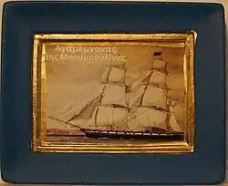 Das Schiff lief am 10. Februar 1820 als Agamemnon, benannt nach dem mythischen König von Mykene, vom Stapel.[2] Die Länge der Brigg wurde mit 48 Ellen angegeben, wobei es nicht ganz klar ist, ob es sich um eine griechische Elle von 0,648 m, eine osmanische von 0,758 m, eine russische von 0,71 m oder ein anderes Längenmaß handelte. Hieraus ergibt sich, dass das Schiff wohl zwischen 31,10 m und 36,38 m lang war. Es hatte zwei Masten und jeweils neun Stückpforten auf jeder Seite zur Bewaffnung mit insgesamt 18 Kanonen. Der Kaufpreis des Schiffes wird mit 25.000 Spanischen Real oder 75.000 Spanische Dollar[2] angegeben. Bouboulina trat dem Geheimbund Filiki Eteria bei, der den Befreiungskampf plante. Schon zwölf Tage vor dem Beginn der Griechischen Revolution hisste sie am 13. März 1821 als erste die griechische Revolutionsflagge.[3]