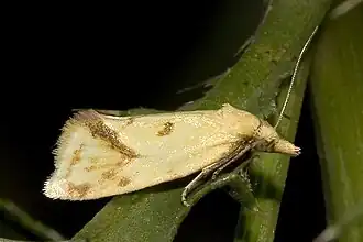 Die Falter haben eine Flügelspannweite von 15 bis 23 Millimeter und sind hell- bis schwefelgelb gefärbt. Vor der Flügelmitte der Vorderflügel befindet sich ein rostfarbener Fleck sowie ein ebenfalls rostfarbener schräger Streifen, der bis zur Flügelmitte reicht, aber gelegentlich auch bis zum Flügelrand verlängert sein kann. Die Hinterflügel sind dunkelgrau.