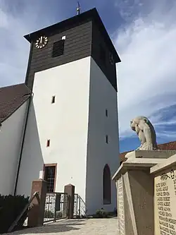 Der massive, 24 Meter hohe Turm ist der älteste Teil der Kirche[3]. Der Helm hat heute eine Höhe von 5 Metern, Kreuz und Hahn zusammen 3 Meter. Die Schießscharten und 1–1,3 m dicken Mauern weißen auf die frühere Nutzung als Wehrturm, welcher Mittelpunkt einer Wehranlage war. 1970 wurden unter dem Turmhelm Eternitplatten angebracht. Die Zifferblätter der Turmuhr sind an der Süd- und Nordseite links, der Ostseite rechts und nach Westen zum Marktplatz mittig angebracht.