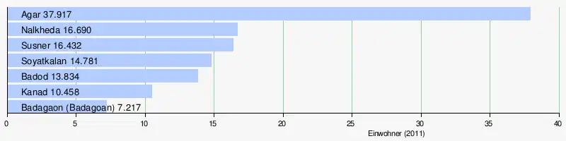 | *) Zahlen beziehen sich auf die Tehsils Agar, Badod, Nalkheda und Susner, damals noch Teil des Distrikts Shajapur. | |