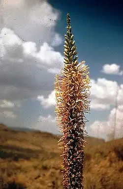 Der 2,5 bis 3,5 Meter hohe „ährige“ Blütenstand hat einen glauken Schaft. Die Teilblütenstände haben meist 2 bis 3 Einzelblüten, die gestielt und 30 bis 45 Millimeter lang sind. Ihre Tepalen sind gelb oder rot oder purpurfarben überhaucht. Sie besitzen fast gleiche Zipfel von 13 bis 20 Millimeter Länge. Die offene Blütenröhre ist 2,5 bis 4 Millimeter lang.