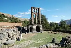 Das bedeutendste Monument im Dorf ist ein ungewöhnlicher Grabbau, der in das 6. oder 7. Jahrhundert datiert wird, also noch vor der Entwicklung der für die armenisch-christliche Erinnerungskultur bedeutsamen Chatschkare entstand. Er befindet sich aus Sissian kommend am Ortsanfang rechts der Straße. Der untere Teil ist ein rechteckiges, aus Basaltquadern gemauertes Bauwerk mit zwei Rundbogenportalen an der westlichen Schauseite, das wohl als Mausoleum geplant war. An den tonnenüberwölbten Hauptraum, der nur durch das offene Portal Licht erhält, wurde im Norden ein ebensolcher kleinerer Raum gebaut. Von der Rückseite führt in der Mitte eine steile achtstufige Treppe auf das Podest. Auf diesem steht eine oktogonale Säule mit einem Volutenkapitell, von dem Rundbögen zu seitlichen halbrunden Wandvorlagen an flankierenden rechteckigen Pylonen als äußere Begrenzung überleiten. Darüber folgt schließlich eine Struktur mit zwei vasenartigen Säulen und drei Rundbögen, die diesmal seitlich auf rechteckigen Pilastern an den äußeren Pfeilern aufliegen. Der bei einem Erdbeben 1931 zerstörte obere Teil wurde restauriert.[6] Als Ornamente kommen Granatäpfel, Weintrauben, Schlangenlinien und sonstige pflanzlichen Muster vor. Die gesamte dreistufige Komposition mit ihren stilistisch verschiedenartigen Architekturelementen und ornamentalen Details wirkt zusammengestückt. Wer Auftraggeber war und wer hier bestattet wurde, ist unbekannt. Das einzige vergleichbare Grabmal in Armenien steht neben der Kathedrale von Odsun.