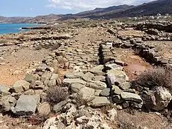 Unweit des Gräberfeldes wurde auf einer Landspitze ein Komplex mehrerer Häuser freigelegt, der im Gegensatz zur Nekropole aus deutlich späterer Zeit, aus MM I A (um 2000 v. Chr.) stammt. Das Ausgrabungsgelände zeigt die Grundmauern eines großen rechteckigen, ursprünglich befestigten Gebäudes mit zentralem Innenhof. Dieses wohl landwirtschaftlichen Zwecken dienende Gebäude mit 37 Räumlichkeiten kann aufgrund dieser Merkmale bereits als Prototyp des minoischen Palastes interpretiert werden. Aufgrund der Anordnung der Räumlichkeiten wird vermutet, dass der Gebäudekomplex von mehreren minoischen Familien, die zusammen einen Clan bildeten, bewohnt wurde.[2]