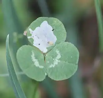 Larve und Mine an einem Weißklee-Blatt | ||||||||||||