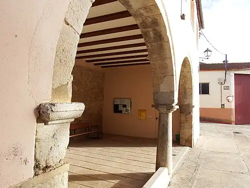- Das Erdgeschoss des Rathauses (ayuntamiento) ist durch zwei Bögen zu einer Vorhalle (Portikus) geöffnet.