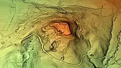 Das Gipfelplateau des Ahlbergs wird von einem Ringwall mit vorgelagertem Graben umschlossen, der an der Nord- und Ostseite fast gradlinig, an der Süd- und Westseite jedoch leicht bogenförmig verläuft. An der Südwestseite befand sich früher eine Tongrube, deren Zufahrt Graben und Wall unterbricht. Einige andere muldenförmige Vertiefungen im Bereich um das Plateau sind ebenfalls auf die Tongewinnung zurückzuführen. Im Südost- und Ostverlauf sind Wall und Graben gut sichtbar erhalten.