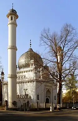 Am 9. Oktober 1924 legte die AAIIL in Berlin den Grundstein für die Wilmersdorfer Moschee.[55] Die älteste erhaltene Moschee Deutschlands wurde am 26. April 1925 eröffnet und war zunächst unter dem Namen „Berliner Moschee“ bekannt. Die Berliner Moscheegemeinde gab von 1924 bis 1940 die Zeitschrift Moslemische Revue heraus.[56] Die Berliner Moschee verlor aber ihre zentrale Stellung noch während des Zweiten Weltkriegs und konnte sie nie wiederherstellen.[57]