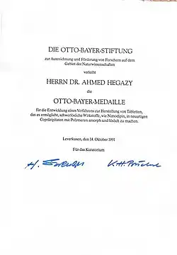 - ↑ Patent EP0078430B2: Verfahren zur Herstellung von festen, schnellfreisetzenden Arzneizubereitungen mit Dihydropyridinen. Angemeldet am 16. Oktober 1982, veröffentlicht am 10. Februar 1993, Anmelder: Bayer AG, Erfinder: Ahmed Hegasy.