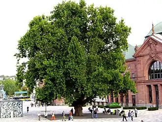 Etwa 100-jährige Ahornblättrige Platane (Platanus ×hispanica) vor dem Wiesbadener Hauptbahnhof | ||||||||||||