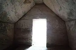 Der Dromos ist etwa 10 m lang und durch einen kurzen Stomion gelangte man in eine 4,74 m breite, etwa 4 m tiefe und 2,30 m hohe Grabkammer. In der Mitte fand man einen großen Grabschacht von 1,05 m Breite und 2,50 m Länge. Die frühesten Begräbnisse stammten aus LH I–II A (etwa 1600–1450 v. Chr.). Zwei Tote waren am Boden des Schachtes in Rückenlage ausgestreckt abgelegt worden. Einer lag mit dem Kopf nach Süden und der andere mit dem Kopf nach Norden. In dem Schacht direkt über diesen wurden ein Mann und eine Frau beigesetzt. Die Frau trug eine Halskette aus gelben und blauen Glasperlen. Der Mann, der offensichtlich durch stumpfe Gewalt starb, wie eine Fraktur an der Stirn zeigt, hatte als Grabbeigaben ein Bronzeschwert und ein Siegel aus Karneol. Bei ihren Füßen lagen Waffen, eine Waagschale, ein sehr großer Spiegel und Keramikgefäße. Diese Art der Bestattung entspricht noch nicht der späteren Praxis, bei der die Toten auf dem Kammerboden abgelegt wurden, sondern der Beisetzung in Schachtgräbern wie zum Beispiel im Gräberrund A in Mykene. Nach LH II B wurde der Schacht bis kurz über dem Paar ausgeräumt und der Inhalt in der Kammer und in Schächte im Dromos verteilt.