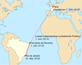 Das Flugzeug startete am 31. Mai 2009 um 19:03 Uhr Ortszeit (22:03 UTC) vom Flughafen Rio de Janeiro-Antônio Carlos Jobim mit Ziel Flughafen Paris-Charles-de-Gaulle, auf dem es um 11:15 Uhr Ortszeit (09:15 UTC) eintreffen sollte. Das Flugzeug flog in eine Gegend mit bekannten schweren Gewittern,[A 3] wie sie in der innertropischen Konvergenzzone üblich sind. Hätte das Flugzeug einen Umweg geflogen, um dem Wetter auszuweichen, so hätte es womöglich den Direktflug nach Paris nicht geschafft, sondern zwischenlanden müssen.[3] Um 01:50 UTC verließ die Maschine nördlich der Inselgruppe Fernando de Noronha den Abdeckungsbereich des brasilianischen ATC-Radars. Innerhalb der nächsten 10 Minuten überließ der Kapitän seinen Platz und seine Rolle als beisitzender und nicht aktiv steuernder Pilot dem ersten Kopiloten, während der zweite Kopilot wie seit dem Start das Flugzeug flog.