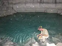 Einen Teil der Hallenfläche nimmt ein im Jahr 2006 etwa vier Meter tiefer Höhlensee ein, in dem sich salzhaltiges Grundwasser mit einer hohen Konzentration von Schwefelwasserstoff befindet.[19][20] Unter der Wasseroberfläche befinden sich Karren, deren Entstehung auf eine absteigende Wasserströmung zurückgeführt wird.[18] Die Analyse des Wassers ergab in den tieferen Bereichen eine Temperatur von 28,5 bis 30 °C, 4,5 ppm Schwefelwasserstoff, einen pH-Wert von 6,8 und einen Salzgehalt von 490 bis 1300 mg/l an Chlorid.[21] Das Wasser des Sees ist unterhalb von einem Meter Tiefe anoxisch.[19][21] Die Schicht schwefelhaltigen Thermalwassers wird durch nur etwa 25 °C warmes Oberflächenwasser überlagert, dessen Eigenschaften weitgehend mit dem umgebenden Grundwasser übereinstimmen, und in dem die Krebstiere des Sees leben.[22]