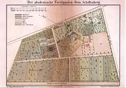 Mit der Gründung der Forstlehranstalt war auch ein Pflanzgarten notwendig geworden. Da der eigentlich zuständige Direktor der Forstlehranstalt Hundeshagen sich mit dem Oberforstmeister und hessischen Geheimrat Karl von Gall nicht verstand, nahm er an der Gestaltung des neuen Forstgartens jedoch wenig Anteil. Der Garten ist deshalb ein Werk von Galls, der ihn ab 1825 – und nicht 1831, wie auf einem Gedenkstein steht – auf einer Fläche von zunächst einem halben Hektar anlegte. Bis 1830 hatte er „nahe an die 400 verschiedene Forstgewächse“,[1] darunter auch zahlreiche fremdländische Baumarten, gepflanzt. Der Pressebericht spricht von einer Pflanzschule von 25 Morgen Größe, in der Forstbotanik studiert und Kulturversuche ausgeführt werden konnten. Seit 1822 oder etwas früher muss an diesem Ort bereits ein „Lustgarten“ existiert haben. Der bereits zitierte Zeitungsartikel erwähnt, dass „der forstbotanische Garten nicht selten den vergnügungssüchtigen Bewohnern von Gießen zum Ziele dient.“[2]
