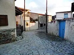 Der Ort liegt etwa 14 Kilometer von der Mittelmeerküste entfernt im Inselinneren im Südteil des Troodos-Gebirges. Der Ort liegt in einer vergleichsweise grünen Umgebung, östlich verläuft der Bach Vasilopotamos und die Landschaft um das Dorf ist vom Olivenbaumanbau geprägt.[2] Gleich nördlich und östlich beginnt der Bezirk Larnaka.