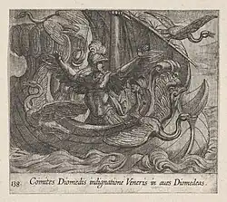 Nach einer Erzählung des Ovid wird Akmon ein Opfer der Aphrodite. Diomedes war es, der vor Troja die Göttin im Kampf verwundet hatte,[1] seitdem verfolgte sie ihn und seine Gefährten mit ihrem Zorn. Als sie auf dem Meer umherirren, wendet sich Akmon an die Mannschaft des Schiffes, die dabei sind, den Mut zu verlieren. Mit dem Mut der Verzweiflung schmäht er die Göttin: