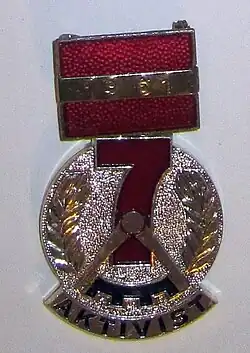 Die goldfarben gehaltene Medaille mit einem runden Mittelteil aus Aluminium, dessen Durchmesser 32 mm ist, zeigt auf ihrem Avers ein nach unten gezogenes Schriftband mit der Aufschrift: AKTIVIST. Darüber ruht das rot emaillierte Mittelfeld mit einer überdimensionalen 7, von der ein Zirkel ausgeht. Die Ziffer wird dabei links und rechts von je einer Ähre flankiert. Unter der Ziffer befindet sich ein Zahnradsegment.