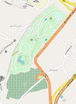 Die Planer legten Wert darauf, islamische Gartenkunst-Traditionen in Design und Botanik zu integrieren, um an die Vergangenheit der Stadt zu erinnern. So wurden für die im Park befindlichen Gartenanlagen und Gebäude Stile aus verschiedenen Regionen und verschiedenen Epochen benutzt, bei den Obstgärten, den Sitzgelegenheiten im Schatten und den fatimidischen Bogengängen. Persische und timuridische Elemente finden sich an den Wasserläufen und Brunnen.[1] So präsentiert sich der Garten als Reminiszenz an die historische islamische Gartenkunst. Das Gelände wird von einem eigenen Wasserreservoir gespeist.[2] Zudem gibt es Cafés, Kinderspielplätze und Aussichtspunkte auf die Stadt.