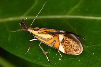 Die Flügelspannweite liegt zwischen 17 und 21 Millimetern.[1] Ihre Vorderflügel besitzen ein markantes Muster aus den Farben Rotbraun, Weiß und metallisch glänzendem Blau. Bemerkenswert sind ferner die großen dunklen Labialpalpen.