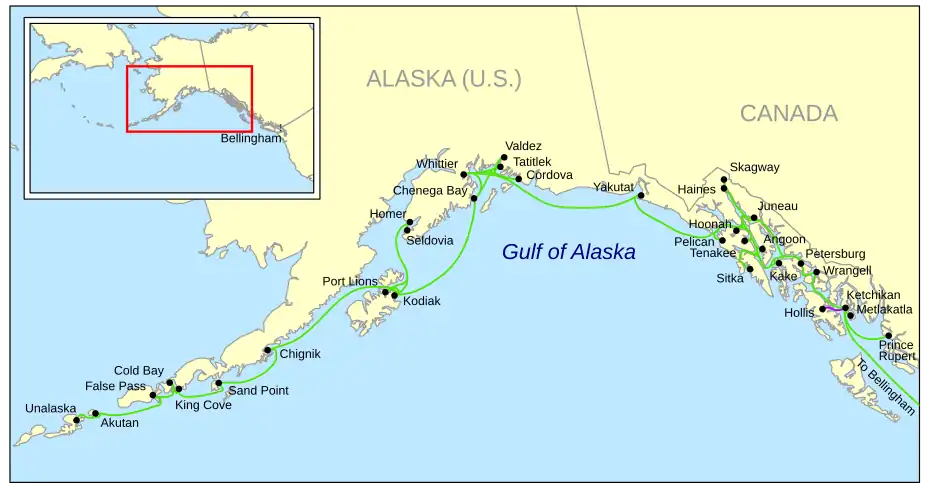 - ↑ Route Guide. Alaska Marine Highway System, abgerufen am 25. August 2025 (englisch).