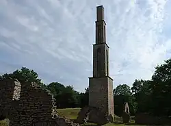 - die zum Kesselhaus gehörenden, von weitem sichtbaren Schornsteine, um die herum die Ruinen des Laugenhauses, des Kesselhauses sowie des Wannenhauses liegen