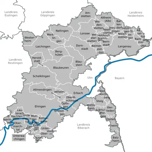 Der Alb-Donau-Kreis wurde durch die Kreisreform am 1. Januar 1973 im Wesentlichen durch Vereinigung der Landkreise Ehingen und Ulm, einiger Gemeinden des Landkreises Münsingen sowie der Gemeinden Oberbalzheim und Unterbalzheim des Landkreises Biberach gebildet.[5] Einige Gemeinden des Landkreises Ehingen gingen an den Landkreis Biberach, und zwei Gemeinden des Landkreises Ulm gingen an den Landkreis Göppingen (nachdem sie bereits 1971/72 in die Stadt Geislingen an der Steige eingegliedert worden waren).
