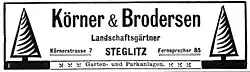 1887 heirateten Brodersen und (Lina Louise) Dorothea Körner, deren Vater Inhaber einer bekannten Landschaftsgärtnerei in Steglitz war, in die Brodersen 1888 eintrat. Nach dem Tod seines Schwiegervaters am 17. März 1894 leitete er zusammen mit seinem Schwager Gustav Körner die Landschaftsgärtnerei Körner & Brodersen. In diesen Jahren entstanden rund 20 größere landschaftliche Anlagen überwiegend für wohlhabende Unternehmer im Rheinland, aber auch in Berlin und im heutigen Polen. Bekannt sind das Schloss Lerbach in Bergisch Gladbach, der Koenig-Park in Guben und zahlreiche Villengärten in Potsdam, Berlin-Grunewald, am Großen Wannsee (Liebermann-Villa), ferner der Villengarten des Landhauses Borsig auf der Halbinsel Reiherwerder am Tegeler See, der heute als Gartendenkmal unter Denkmalschutz steht.[1] Auch städtebauliche Projekte, die Anlage von Galopprennbahnen in Köln sowie anderer Sporteinrichtungen gehörten dazu.
