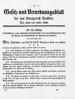 In Sachsen erfolgten zur Umstellung der allgemein gültigen Maß- und Gewichtseinheiten auf das metrische System sehr frühe Bemühungen. Dafür schuf das Innenministerium die Königliche Normalaichungscommission in Dresden, deren inhaltliche Arbeit durch Julius Ambrosius Hülße geleitet wurde und bei Weinlig ministeriell eingebunden war. In der adäquaten Kommission für den Deutschen Zollverein übernahm Weinlig die Repräsentanz für das Königreich Sachsen, der im Verhinderungsfall Hülße zu diesem Zweck abordnen ließ. Die dort beratenen Vorschläge flossen in die Gesetzgebung des Norddeutschen Bundes ein. Sie beruhen weitgehend auf den von Hülße erarbeiteten und durch Weinlig vorgeschlagenen Regelungen.[7] Die Norddeutsche Maß- und Gewichtsordnung vom 17. August 1868 trat am 1. Januar 1872 in Kraft.