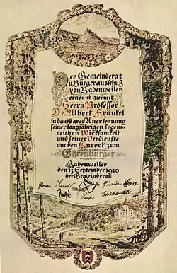 - ↑ Bezirksärztekammer Südbaden: Stiftung der Albert-Fraenkel-Plakette und Verleihungsgrundsätze. (PDF; 12 kB) Abgerufen am 7. November 2012.