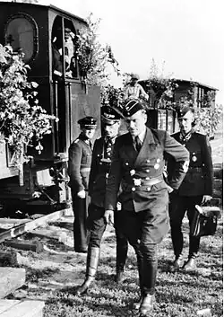 Bereits seit dem Ende des Überfalls auf Polen im September 1939 war die Ostbahn im Generalgouvernement mit „Umsiedlungstransporten“ betraut, zu denen später auch Deportationen von Juden in Ghettos und Lager gehörten. Als im Frühsommer 1942 der Höhere SS- und Polizeiführer im Generalgouvernement, Friedrich-Wilhelm Krüger, die Bereitstellung von Sonderzügen für geplante Großaktionen gegen die jüdische Bevölkerung forderte, gab der Präsident der Generaldirektion der Ostbahn (Gedob), Adolf Gerteis, an, aufgrund des hohen Transportmittelbedarfs der Wehrmacht nur wenige Züge zur Verfügung stellen zu können. Auf einer seiner ersten Dienstreisen besprach sich Ganzenmüller am 26. Juni 1942 in Krakau unter anderem dazu mit Josef Bühler, dem Stellvertreter des Generalgouverneurs, und Adolf Gerteis. Zudem wurden im Juli 1942 Bauarbeiten an der Bahnstrecke durchgeführt, die in Richtung des Vernichtungslagers Sobibor führte.[39] Der Reichsführer SS Heinrich Himmler drang zugleich darauf, die Juden im Generalgouvernement möglichst schnell in die Vernichtungslager zu deportieren, und hatte offensichtlich darüber am 16. Juli 1942 im Führerhauptquartier mit Hitler gesprochen. Noch am gleichen Tag telefonierte sein persönlicher Adjutant Karl Wolff von dort aus mit dem neuen Staatssekretär Ganzenmüller.[40] Bereits zu Ganzenmüllers Vorgänger Kleinmann hatte der umgängliche Wolff Verbindungen unterhalten. Wolff ersuchte nun Ganzenmüller, seinen Einfluss auf die Gedob geltend zu machen, um mehr Transportraum für die SS bereitzustellen.[39]