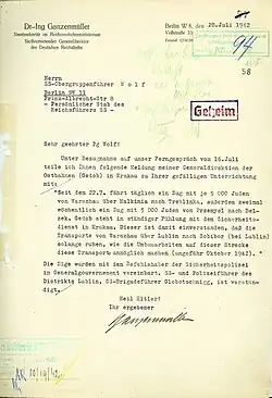 „Seit dem 22. 7. fährt täglich ein Zug mit je 5000 Juden von Warschau über Malkinia nach Treblinka, außerdem zweimal wöchentlich ein Zug mit 5000 Juden von Przemysl nach Belzec. Gedob steht in ständiger Fühlung mit dem Sicherheitsdienst Krakau. Dieser ist damit einverstanden, daß die Transporte von Warschau über Lublin nach Sobibor (bei Lublin) solange ruhen, wie die Umbauarbeiten auf dieser Strecke diese Transporte unmöglich machen (ungefähr Oktober 1942)“[41]