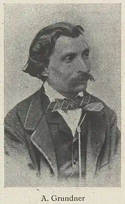 - ↑ Grundners Eigenwerbung auf seinen späteren Carte-de-Visite–Rückseiten enthielt den Hinweis „seit 1854 etabliert“, siehe: Schmidtsiefen, S. 29.