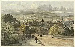 Handkolorierter Stich von Parramatta, Blick nach Norden entlang der Marsden Street, von der Ecke Campbell St. St. Johns befindet sich unmittelbar hinter der Eisenbahnüberführung, und links von St. Johns steht die Uniting Church, gegenüber der Macquarie Street. In der Ferne ist St. Patricks zu sehen.