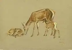In den Düsseldorfer Ausstellungen fiel Holz bereits durch eines seiner ersten Bilder, eine Ansicht von Neuss, auf, der weitere Architekturdarstellungen folgten, wie etwa Der Marktplatz in Düsseldorf mit den Ständen der Marktfrauen und ihren Kunden vor dem Reiterstandbild des Jan Wellem.[1] Dann widmete er sich zunehmend und ganz in der Nachfolge seines ersten Lehrers Christian Kröner der Landschaftsmalerei, deren Motive er in der Eifel, an der Mosel und am Niederrhein fand, seltener in anderen Regionen, etwa mit dem Gemälde Kaysersberg im Elsass. Die Landschaften charakterisierte er in den typischen Stimmungen von Tages- und Jahreszeiten und belebte sie häufig mit weidenden Schafen oder Rudeln und Einzeldarstellungen von Hoch- und Niederwild: In der Hocheifel bei Adenau,[2] Blick von den Bergen auf eine im Tal liegende Burganlage in der Eifel, Blumenwiese in der Eifel mit äsenden Rehen oder Wiesenlandschaft mit weidenden Kühen. Winterliche Motive zeigen Lauernder Fuchs vor dem Mäuseloch im Schnee, Schnürender Fuchs im Schnee oder Wildschweinrudel im Winter. Gelegentlich sind auch Menschen in die Kompositionen eingefügt, etwa ein Bauer mit Sense in Ginsterblüte in der Eifel mit Schäfer und Herde,[3] Jäger auf nächtlichem Heimweg auf dem alten Mörsenbroicher Weg[4] oder Alte Bekanntschaft – Landbriefträger und Rehrudel in sommerlicher Landschaft.[5] Da der Künstler seine Arbeiten nicht datierte, sind sie nur schwer zeitlich einzuordnen. Ein spezieller Auftrag für Albert Holz waren die Panoramen für die Freigehege des Düsseldorfer Zoos, Nordland und Afrikanische Steppe. entstanden wohl im Zusammenhang mit der Erneuerung der Eisbärenanlage, 1925, und der Vorbereitung der Reichsausstellung Schaffendes Volk (Motto Afrika in Düsseldorf), 1937. Auch Aquarelle und Zeichnungen, vor allem Tierdarstellungen, sind von dem Künstler bekannt geworden.
