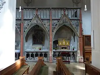 Spätgotische dreibogige Grabanlage in der Niedermünsterkirche: rechts Schrein und Grabfigur des hl. Erhard, links Steinsarkophag und Grabfigur des hl. Albert