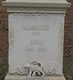 1731 schuf der märkische Gelehrte Jacob Paul von Gundling eine erste ausführliche Biographie Albrechts.[5] 1864 folgte Otto von Heinemann mit einer weiteren Darstellung, die alle bekannten Urkunden und Chroniken auswertete und lange Jahre maßgebend blieb.[6] Im späten 19. Jahrhundert wurde Albrecht im Zuge des Nationalismus als Wegbereiter der deutschen Besiedlung in der zuvor wendischen Mark Brandenburg verehrt, und ihm wurden Denkmäler in Ballenstedt und in der Berliner Siegesallee gesetzt.
