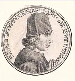 - Harry Gerber: Albrecht (von Bayern), Bischof von Straßburg. In: Neue Deutsche Biographie (NDB). Band 1, Duncker & Humblot, Berlin 1953, ISBN 3-428-00182-6, S. 175 (Digitalisat).