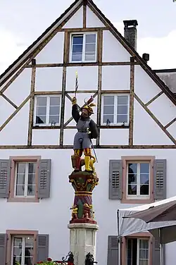 An die südliche Schmalseite des längsrechteckigen Doppeltrogs aus Kalkstein ist ein Brunnenstock im Renaissancestil angebaut. Die beiden Ausgussröhren in seinem achteckigen Mittelstück sind mit Löwenköpfen verziert. Der Schaft des Figurensockels ist mit Musikantenskulpturen und einem Volutenkapitell verziert. Darauf steht die lebensgrosse Darstellung eines bärtigen Bannerträgers im Harnisch und mit Barett, der mit seiner rechten Hand das Stadtbanner emporstreckt, während die linke Hand am Rücken angelegt ist und den Degen hält.