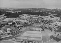 Koppigen und Umgebung, fotografiert aus einem Ballon am 16. April 2011; Alchenstorf ist auf dem Bild oberhalb von Koppigen in der Bildmitte zu finden