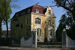 Zum Denkmal gehört auch der große Landschaftspark. Die zweigeschossige Villa ist mit reichgestalteter Stuckornamentik verziert. Das Haus hat ein Mansardenwalmdach.