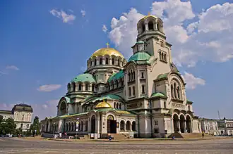Die Kathedrale ist eines der Wahrzeichen der bulgarischen Hauptstadt Sofia. Sie wurde von dem russischen Architekten Alexander Pomeranzew entworfen, der auch das Warenhaus GUM in Moskau plante. Der Grundstein wurde 1882 gelegt; der eigentliche Bau erfolgte jedoch größtenteils zwischen 1904 und 1912.[1] Die Kathedrale im neobyzantinischen Stil befindet sich auf dem Alexander-Newski-Platz im Zentrum der Stadt und ist dem russischen Nationalheiligen Alexander Newski geweiht.