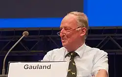Schnell profitierte die Partei, so Beobachter, von seiner und Adams Berufserfahrung in den Medien.[36] Gauland schärfte mit einem kontrovers diskutierten Grundsatzpapier das außenpolitische Profil der AfD, indem er sich für eine Annäherung an Russland einsetzte.[21] In der Öffentlichkeit galt er als innerparteilicher Gegenspieler Luckes.[21] Auch von Sozialwissenschaftlern wird er nicht zuletzt wegen seiner Themensetzung dem rechten Parteiflügel der AfD zugerechnet.[51][52] Forscher wie David Bebnowski,[53] Franz Walter,[54] Lars Geiges,[54] Stine Marg,[54] Alexander Häusler,[55] Gudrun Hentges,[56] Jürgen W. Falter,[57] Frank Decker,[58] Sebastian Friedrich,[59] Lothar Probst,[60] Susanne Merkle[61] und Elmar Wiesendahl[62] bezeichnen diesen und Gaulands Rolle in der Partei als überwiegend national- oder aber auch rechtskonservativ.