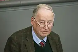 Eberhardt Alexander Gauland (* 20. Februar 1941 in Chemnitz) ist ein deutscher Jurist, Publizist und rechtspopulistischer Politiker (AfD, vormals CDU). Von 2017 bis 2019 war Gauland einer von zwei AfD-Bundessprechern (Parteivorsitzenden). Seit 2017 ist er Mitglied des Deutschen Bundestages, wo er von 2017 bis 2021 neben Alice Weidel einer von zwei Fraktionsvorsitzenden der Bundestagsfraktion seiner Partei war. Seit 2019 ist er Ehrenvorsitzender der AfD und seit 2021 auch der AfD-Bundestagsfraktion. Für die Bundestagswahl 2025 kandidierte er für die sächsische AfD, nachdem er ursprünglich seinen Rückzug aus der Politik bekanntgegeben hatte,[1] und erlangte ein Direktmandat.