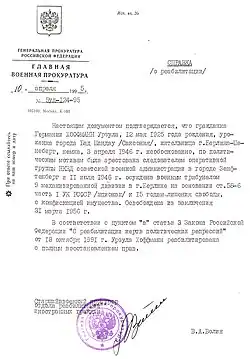 1995 wurde die Mutter und 2001 auch der Sohn von der russischen Hauptmilitärstaatsanwaltschaft vollständig rehabilitiert und als Opfer politischer Verfolgung anerkannt.